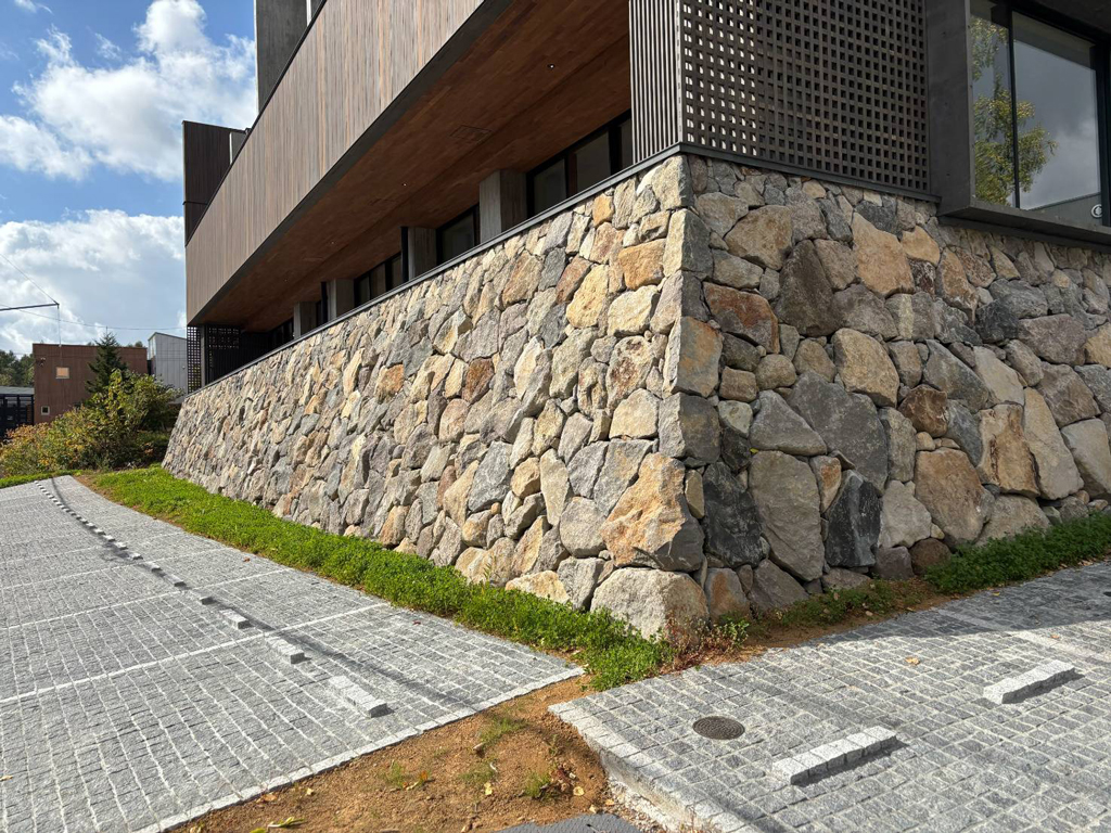 自然石の風合いを生かし、ひとつひとつ丁寧に積み上げることで、重厚感の中にもやわらかさを感じる仕上がりとなりました。